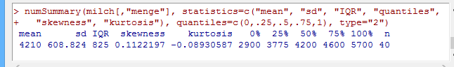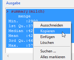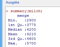 Im Ausgabefenster bekommen Sie die Ausgabe des R-Befehls summary() angezeigt: