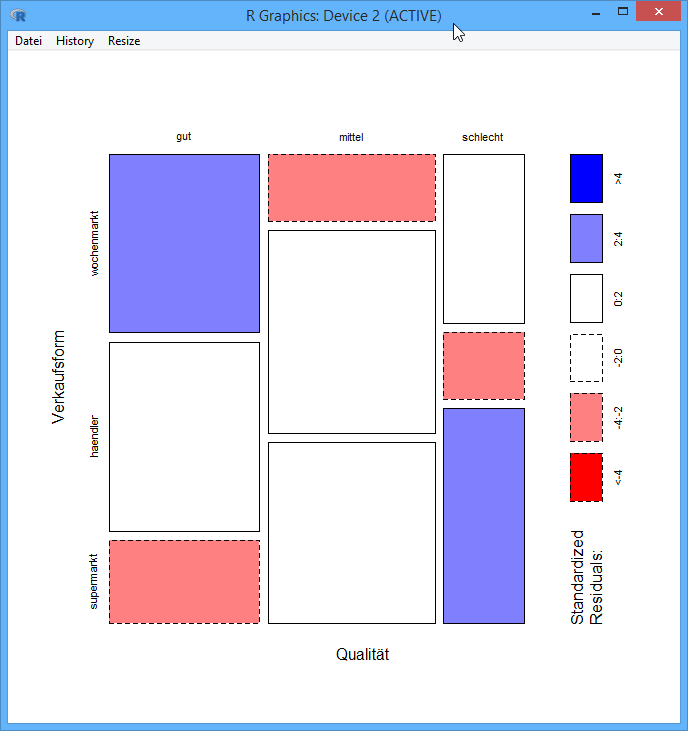 Die eingefärbten Zellen markieren Abweichungen von der Nullhypothese Unabhängigkeit: Blaue Zellen sind größer als man sie bei Unabhängigkeit erwarten würde, hier gute Qualität im Wochenmarkt (links oben) und schlechte Qualität im Supermarkt (rechts unten). Umgekehrt sind rote Zellen kleiner als unter Unabhängigkeit erwartet, z.B. gute Qualität im Supermarkt (links unten).